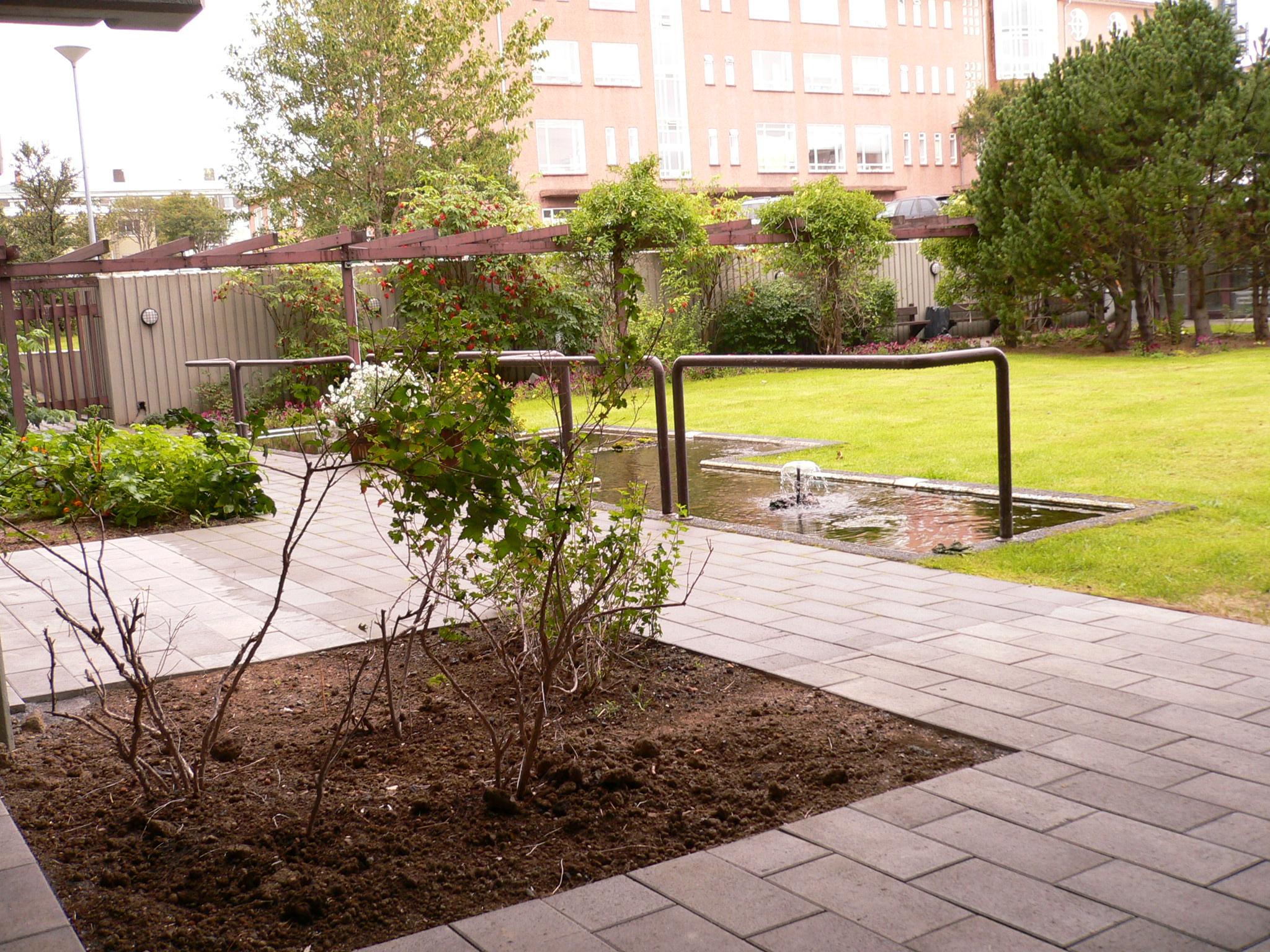 Útgengt er í afgirtan garð þar sem íbúar njóta til samveru, félagsstarfs og útiveru af öllu tagi. Garðurinn státar af gróðurhúsi þar sem má finna elsta vínvið Reykjavíkur, með uppskeru hvert haust.