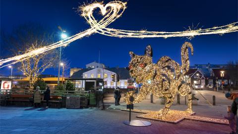 The cat is about 5 meters tall, 6 meters wide, and illuminated with 6,500 LED lights. The Yule Cat was first installed in 2018 and has always attracted much attention from passersby. The Yule Cat's design is a collaboration between Reykjavík City, MK-illumination in Austria, and Garðlist.