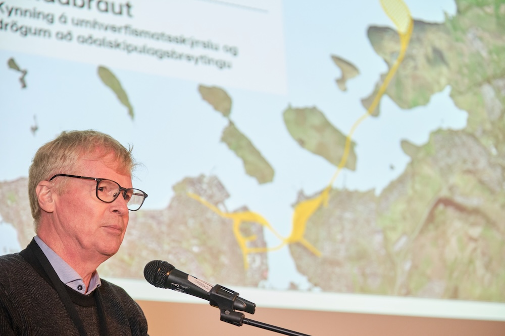 The meeting covered Sundabraut route options discussed in the environmental assessment report: routes with high or low bridges over Kleppsvík Bay or tunnels underneath, as well as alignments continuing over to Kjalarnes. The presentation also covered how the construction would improve traffic flow in the capital area and its alignment with planned changes to Reykjavík's municipal plan.