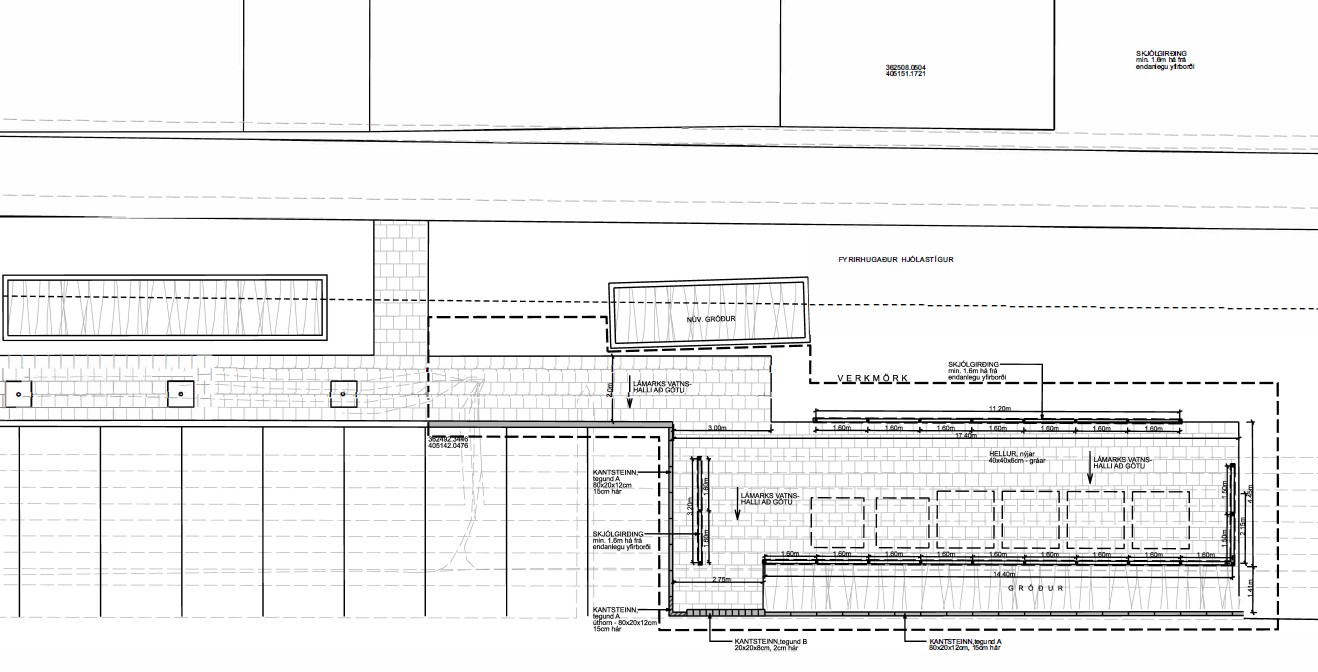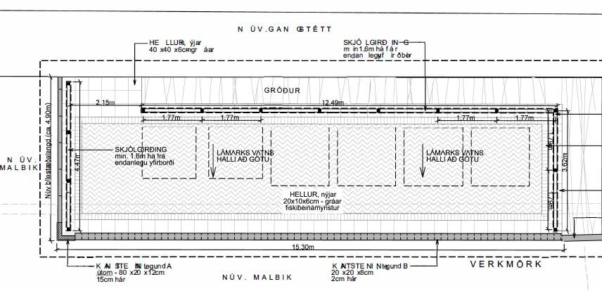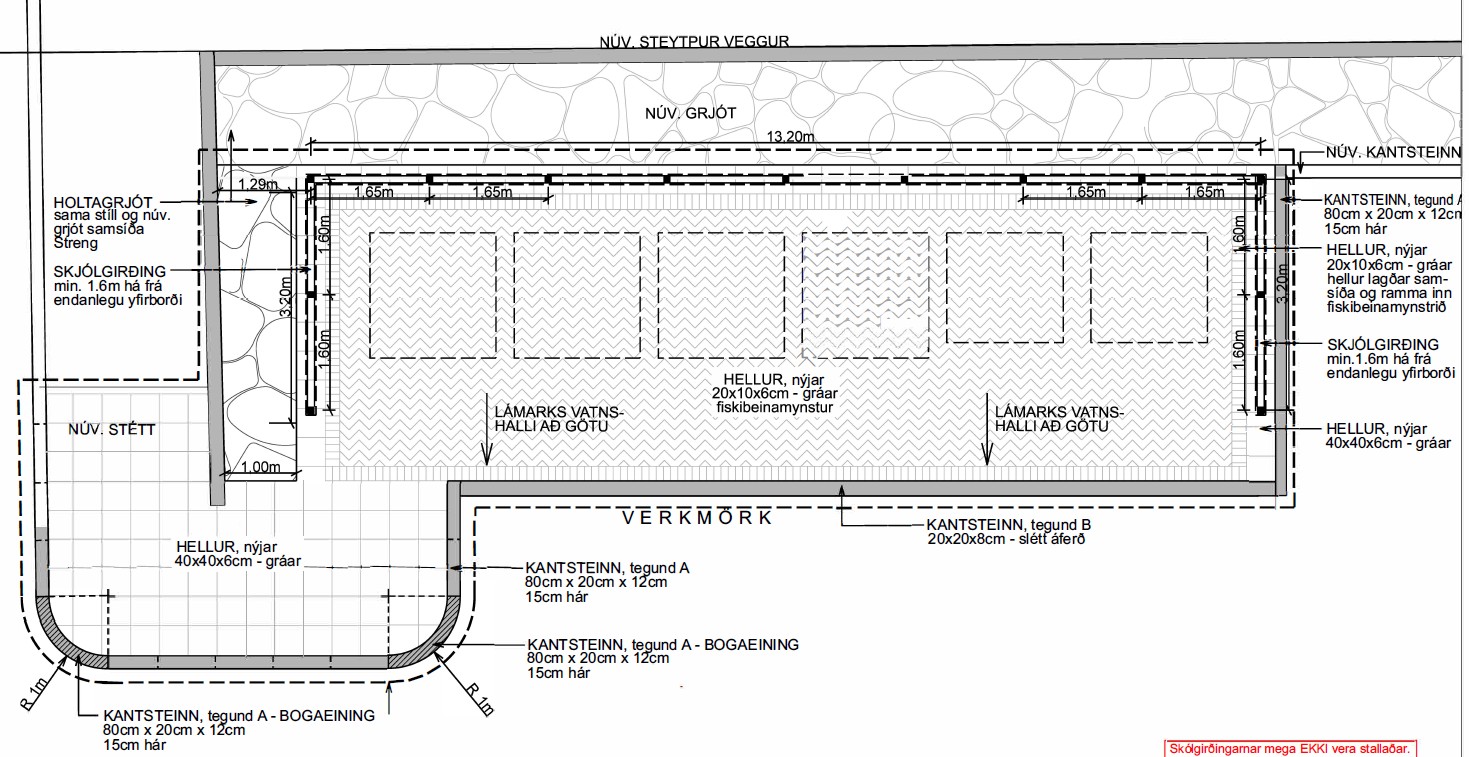Helstu verkliðir eru upptaka á núverandi yfirborði og yfirborðsefnum, jarðvinna, hellu- og kantsteinslögn, grasþakning og smíði timburskjólveggja.