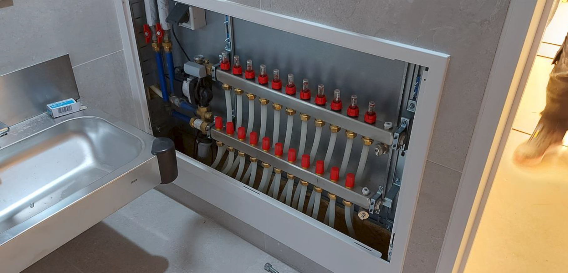 Búið að leggja gólfhita og flota yfir og hleypa á hita á kerfið