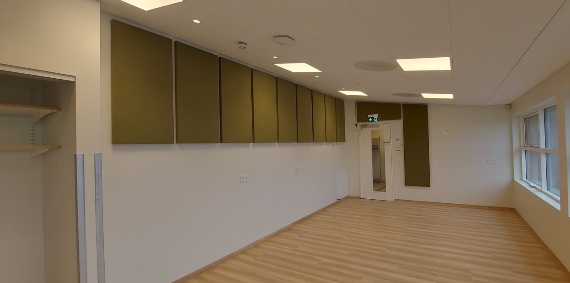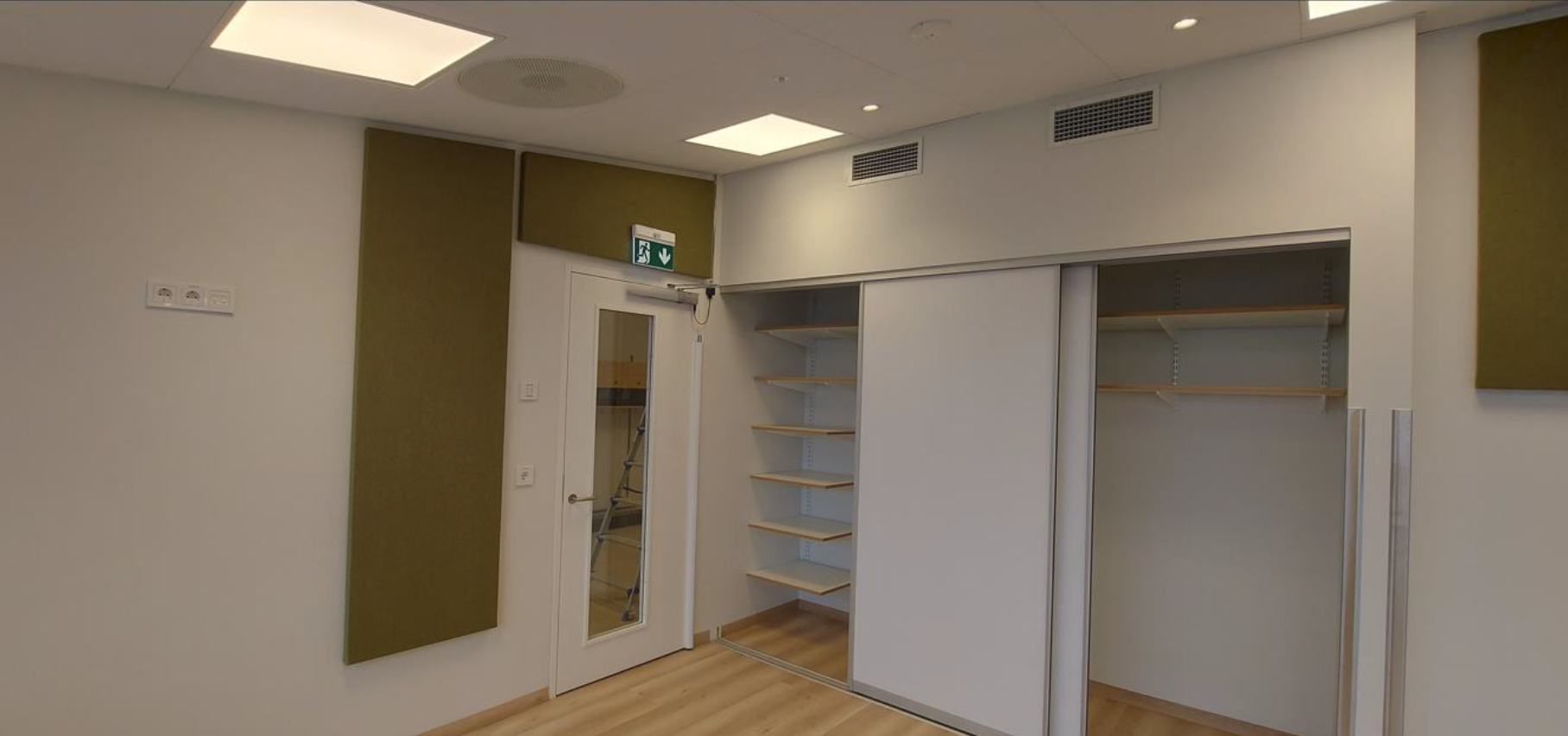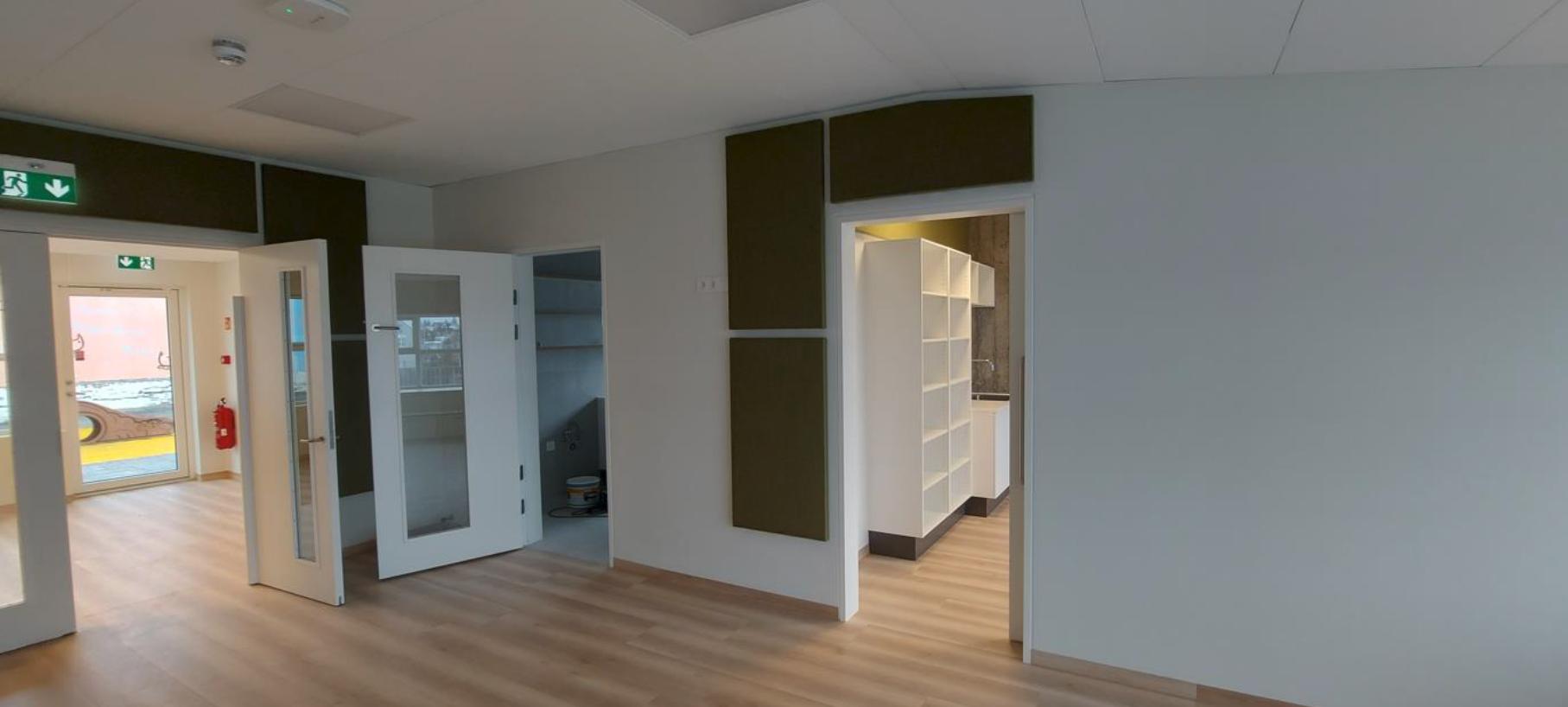 Unnið var við uppsetningu á hljóðbölum og lokafrágangi á innréttingum (setja höldur)