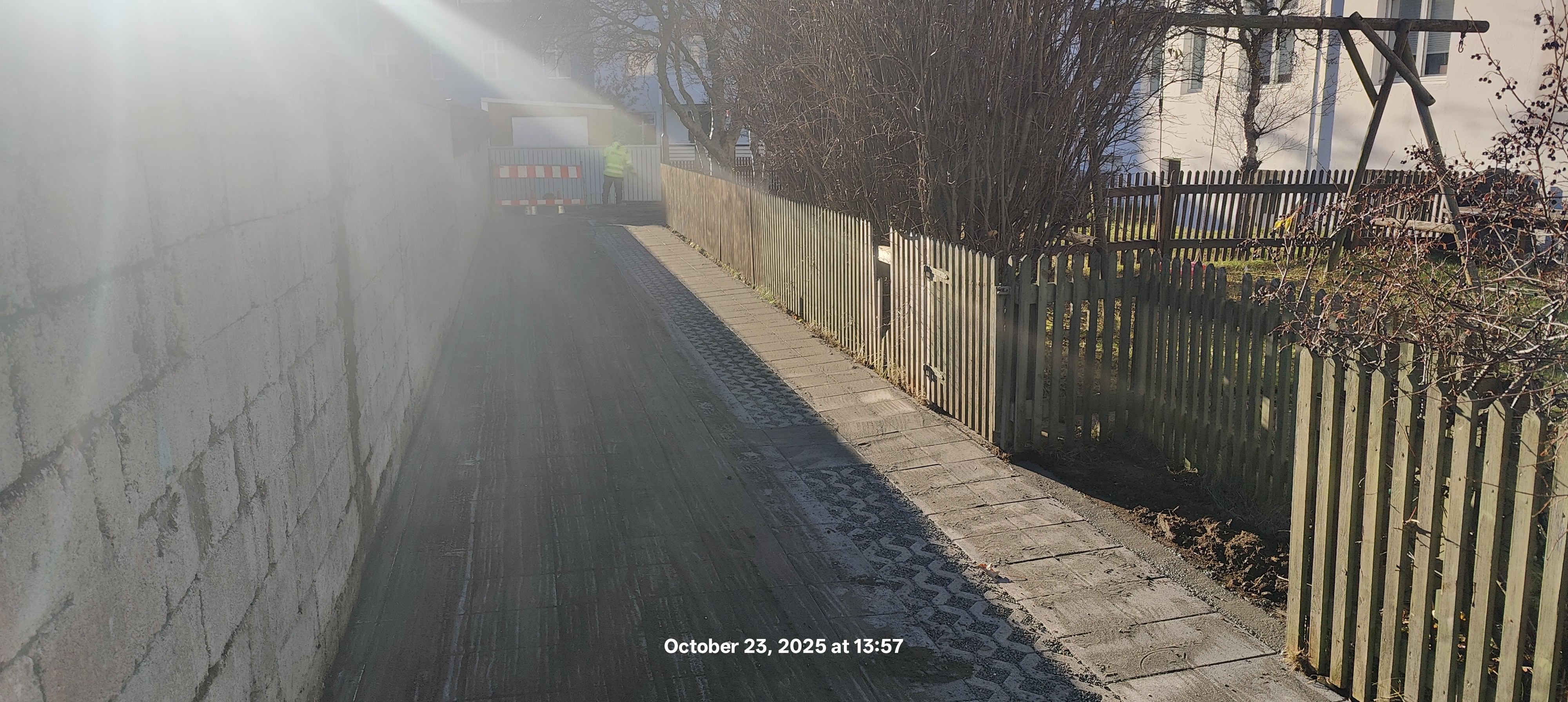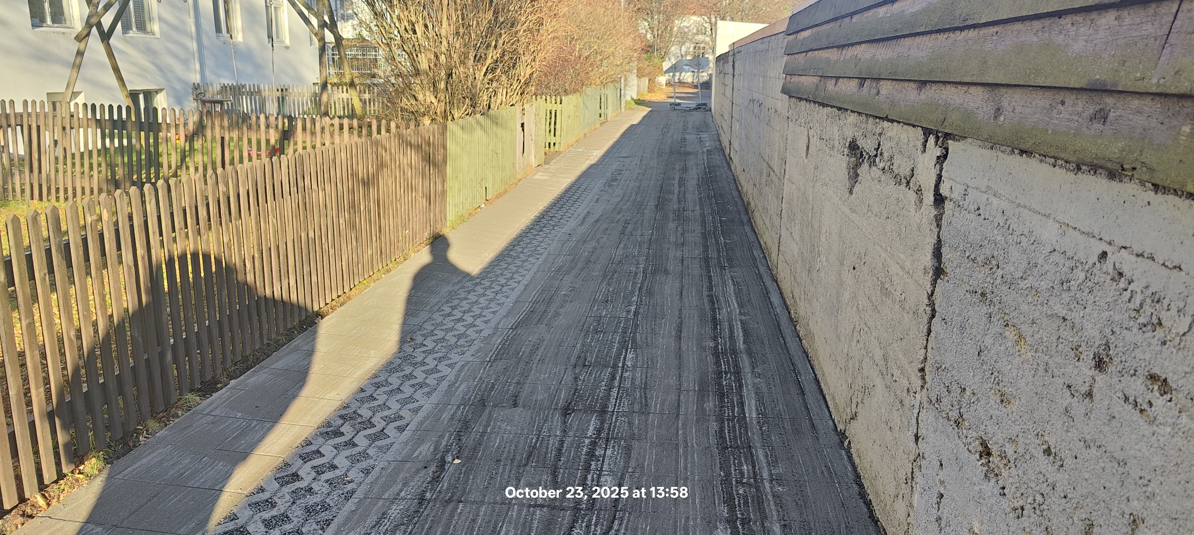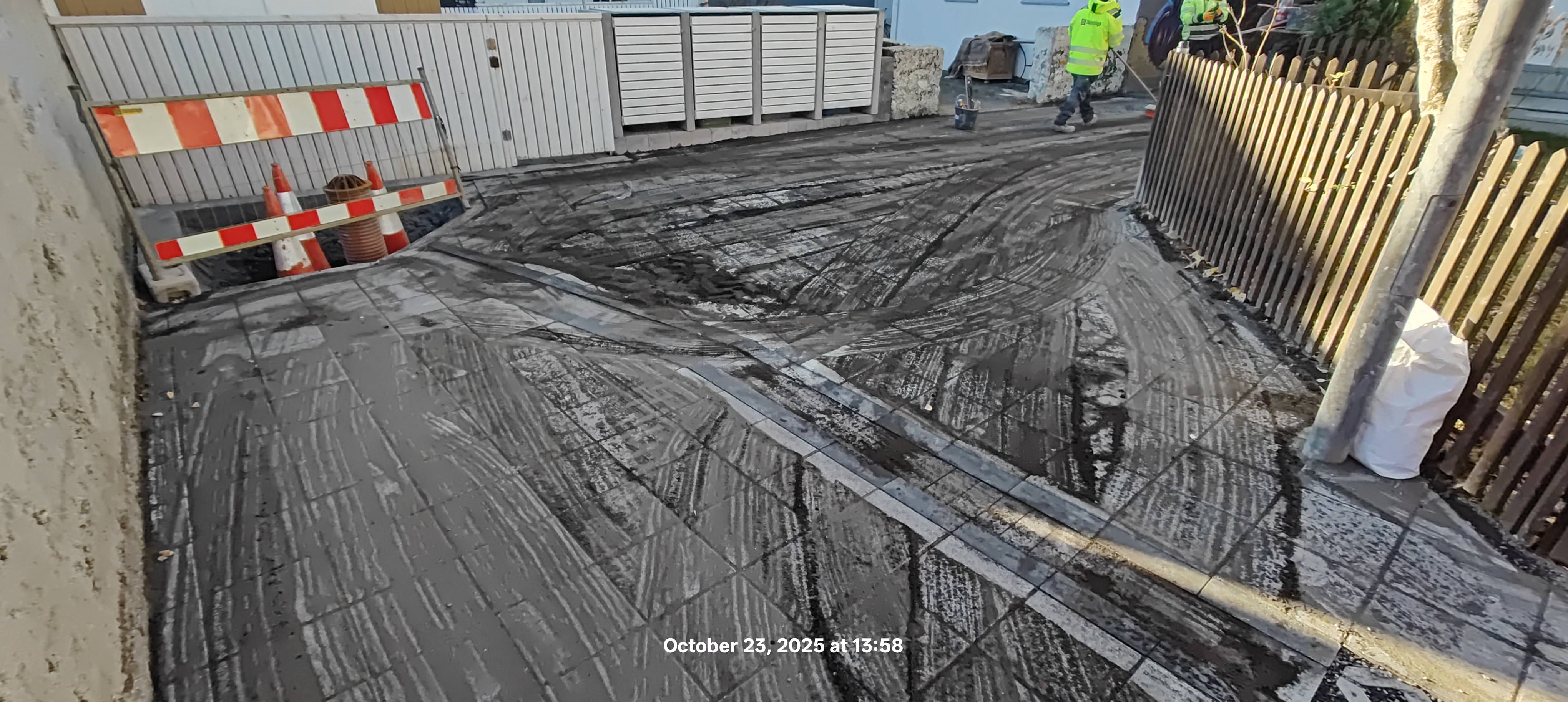 Jarðvinnu og hellulögn er lokið. Verkið er nokkurn veginn á áætlun og hafa framkvæmdir gengið vel.