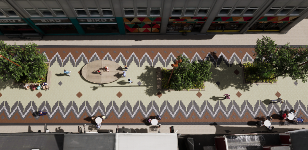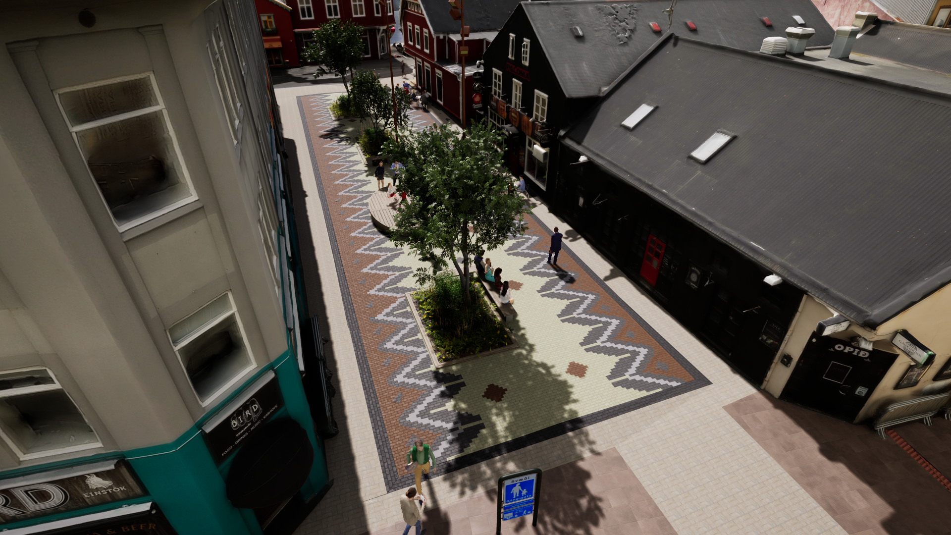Nýtt yfirborð götu verður hellulagt ásamt gróðurbeðum og setbekkjum.