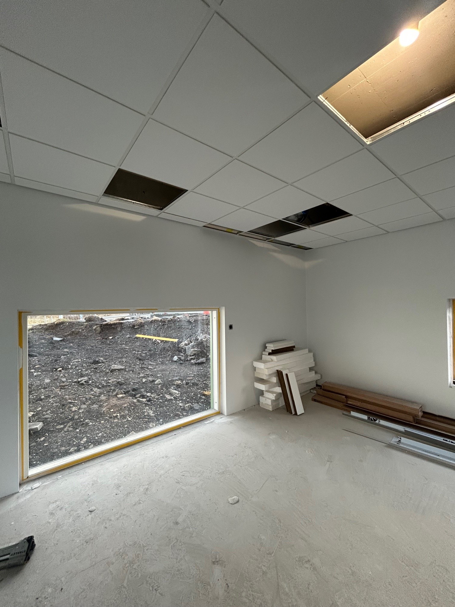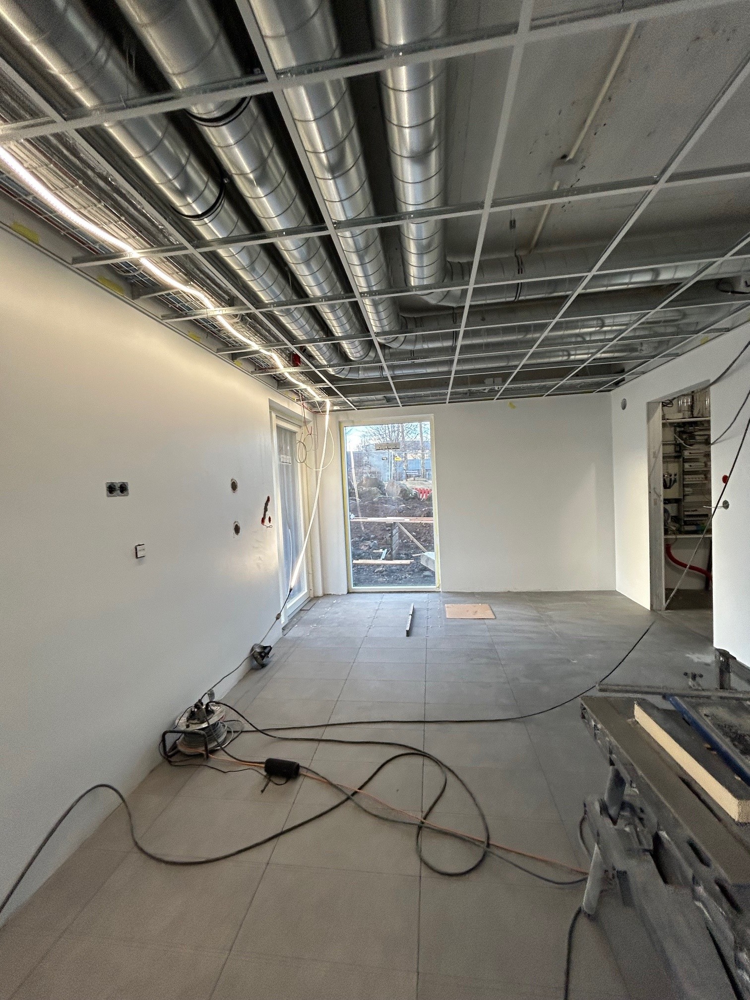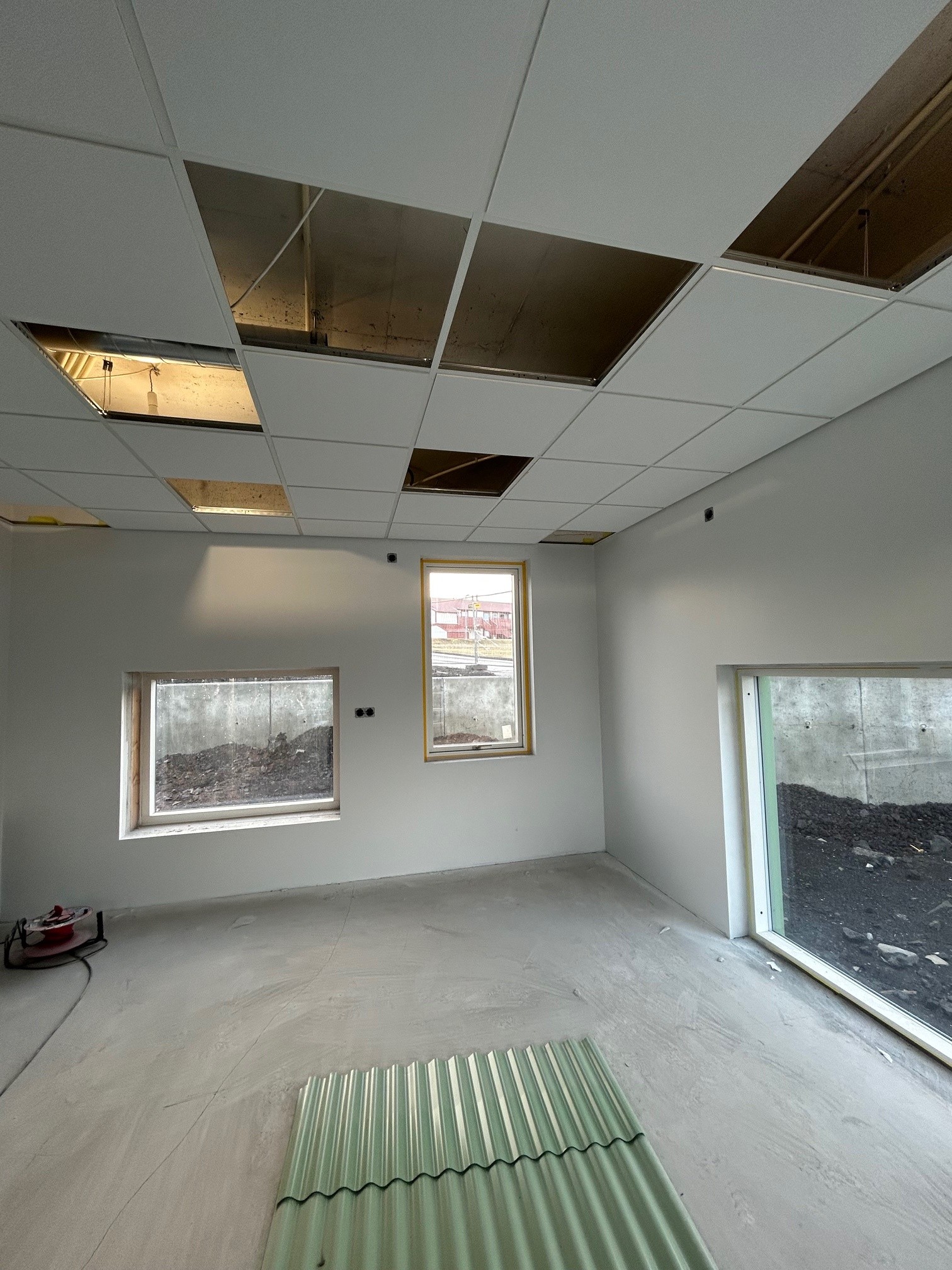 Verið er að ganga frá eftirfarandi kerfisloftum, flísalögn, gólfdúkum