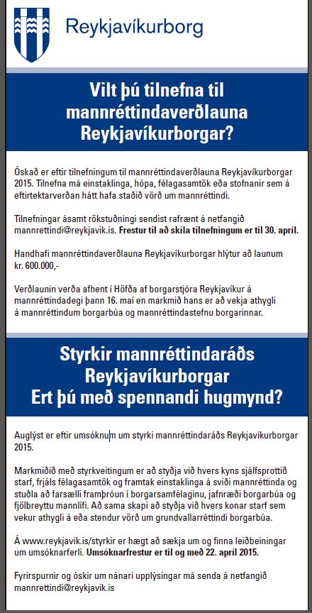Óskað er eftir tilnefningum til mannréttindaverðlauna Reykjavíkurborgar 2015. Tilnefna má einstaklinga, hópa, félagasamtök eða stofnanir sem á eftirtekarverðan hátt hafa staðið vörð um mannréttindi.