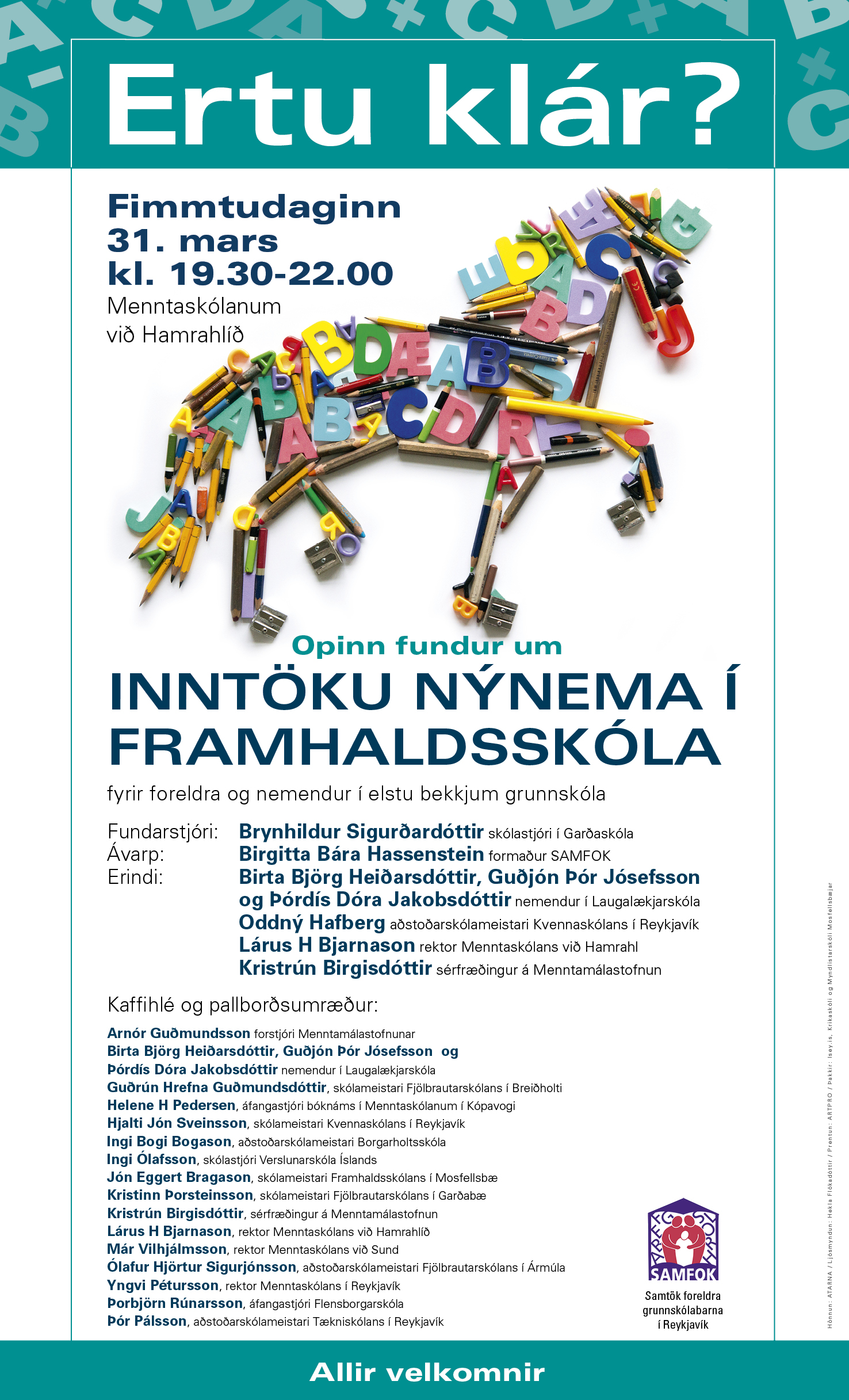 SAMFOK - samtök foreldra grunnskólabarna í Reykjavík - bjóða 10. bekkingum og foreldrum þeirra til fundar um inntöku nýnema í framhaldsskóla nú í haust. Fundurinn verður í Menntaskólanum í Hamrahlíð fimmtudaginn 31. mars