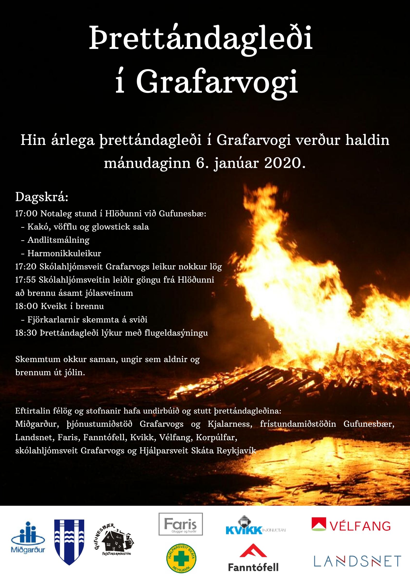 Í Grafarholti verður þrettándaganga á sunnudaginn 5. janúar. Þar verður safnast saman og gengið frá Guðríðarkirkju að brennunni í Leirdal klukkan 18.30. Dagskráin verður með hefðbundnu sniði en lúðrasveit Verkalýðsins leiðir gönguna, Þegar komið er á áfangastað verður boðið upp á skemmtiatriði og jólasveinar fá síðasta tækifæri til að kætast með börnunum. Drengir í 4. flokki Fram skottast um svæðið og selja kakó og kleinur, sem ætti að ylja gestum. Kveikt verður í brennunni um 19.00 og Fram slær botninn í hátíðina með flugeldasýningu klukkan 20.00.
