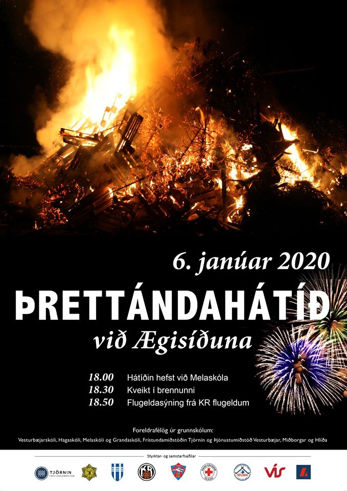 Þrettándahátíð í Vesturbæjar, Miðborgar og Hlíða hefst klukkan 18.00 við Melaskóla, mánudaginn 6. janúar. Þar leiða ungmenni fjöldasöng og gengið verður með kyndla að brennunni á Ægisíðu. Borinn verður eldur að kestinum og skotið upp flugeldum. Brennan er í samstarfi við KR-flugelda. Mögulega munu jólasveinarnir kíkja við áður en þeir leggja af stað til fjalla. Dagskrá