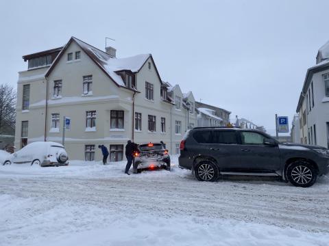 Fólk er beðið um að fara ekki út á vanbúnum bílunum, bæði vegna þess að bílar á slitnum dekkjum spóla í þessari ófærð og líka vegna hættu á að festast í sköflum. Það tefur verulega fyrir snjóruðningstækjum sem nú fara um götur og þurfa að nota plássið sem gefst.