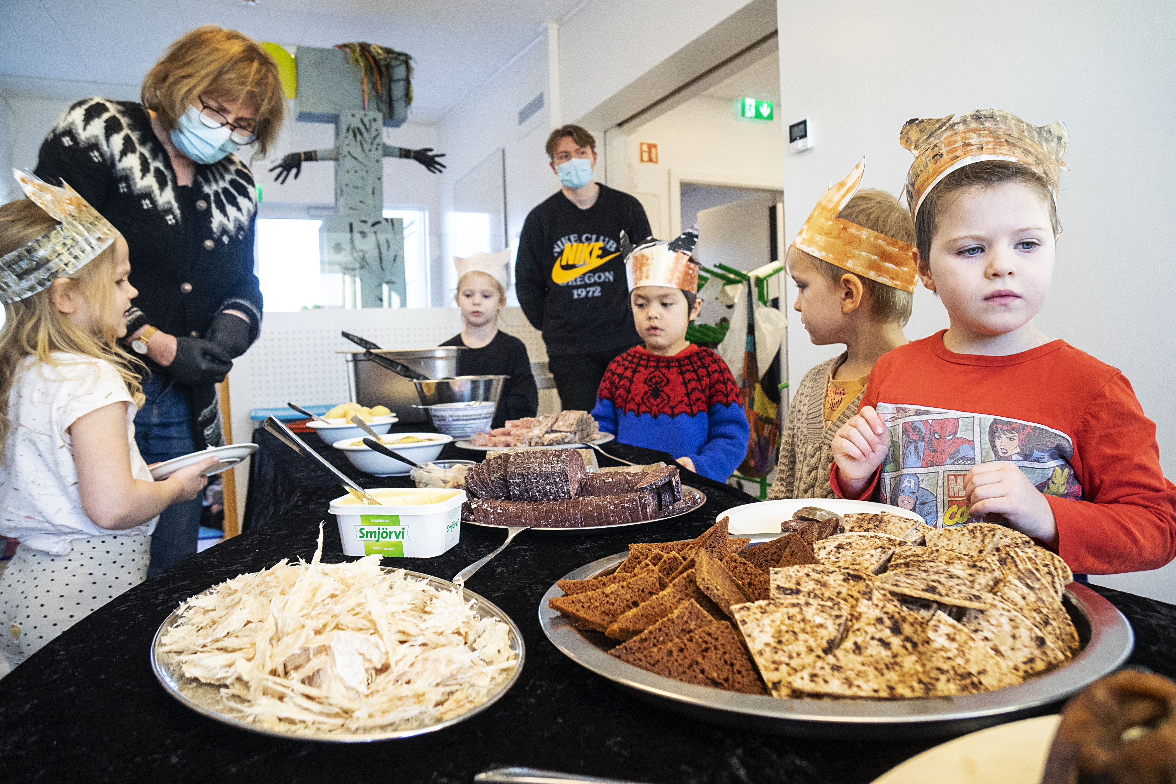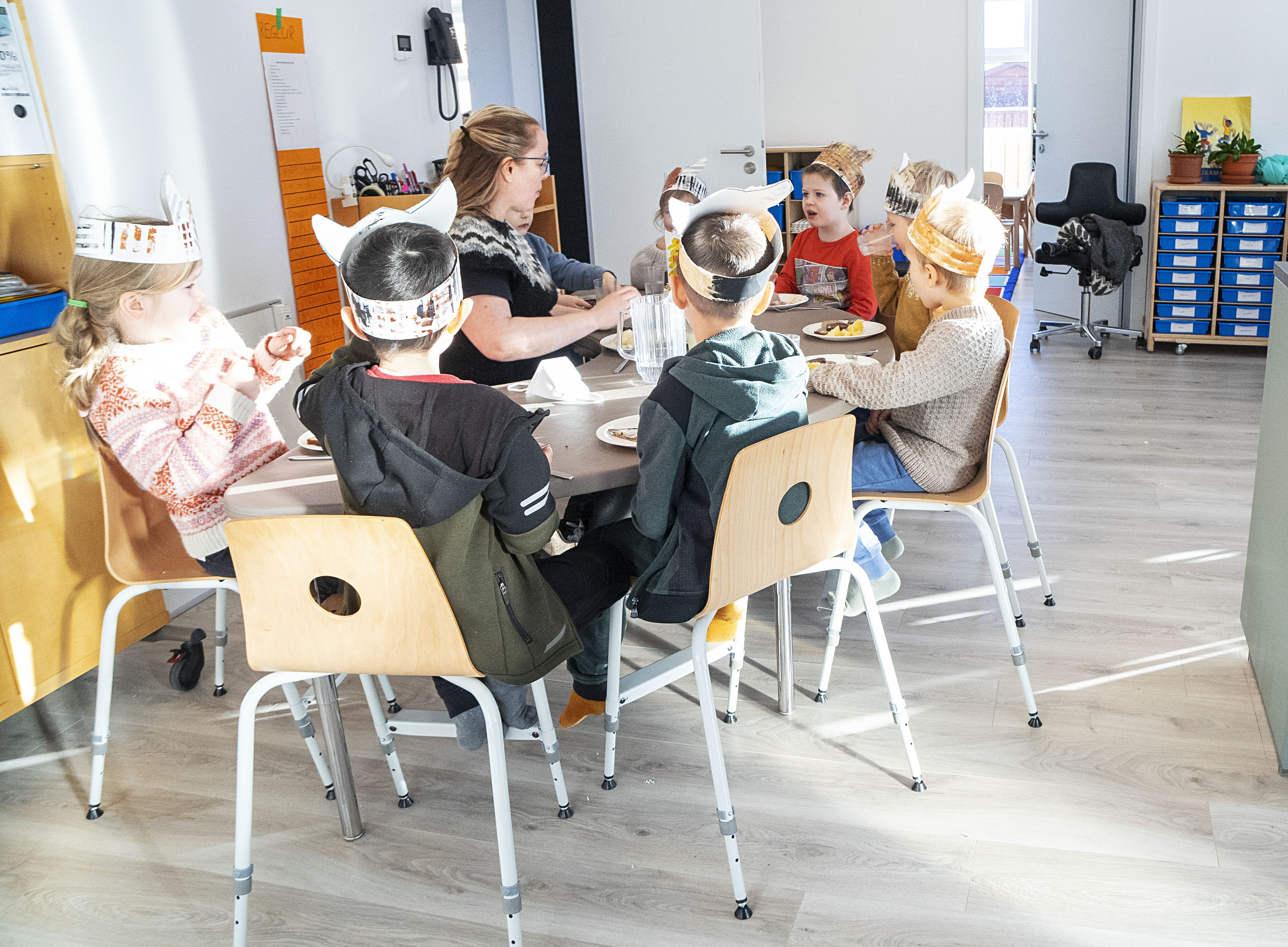 „Hvenær fáum við þorramatinn,“ spyr einn, augljóslega sannur víkingur og börnin trítla inn á deildir til að gæða sér á þjóðlegum veitingum.