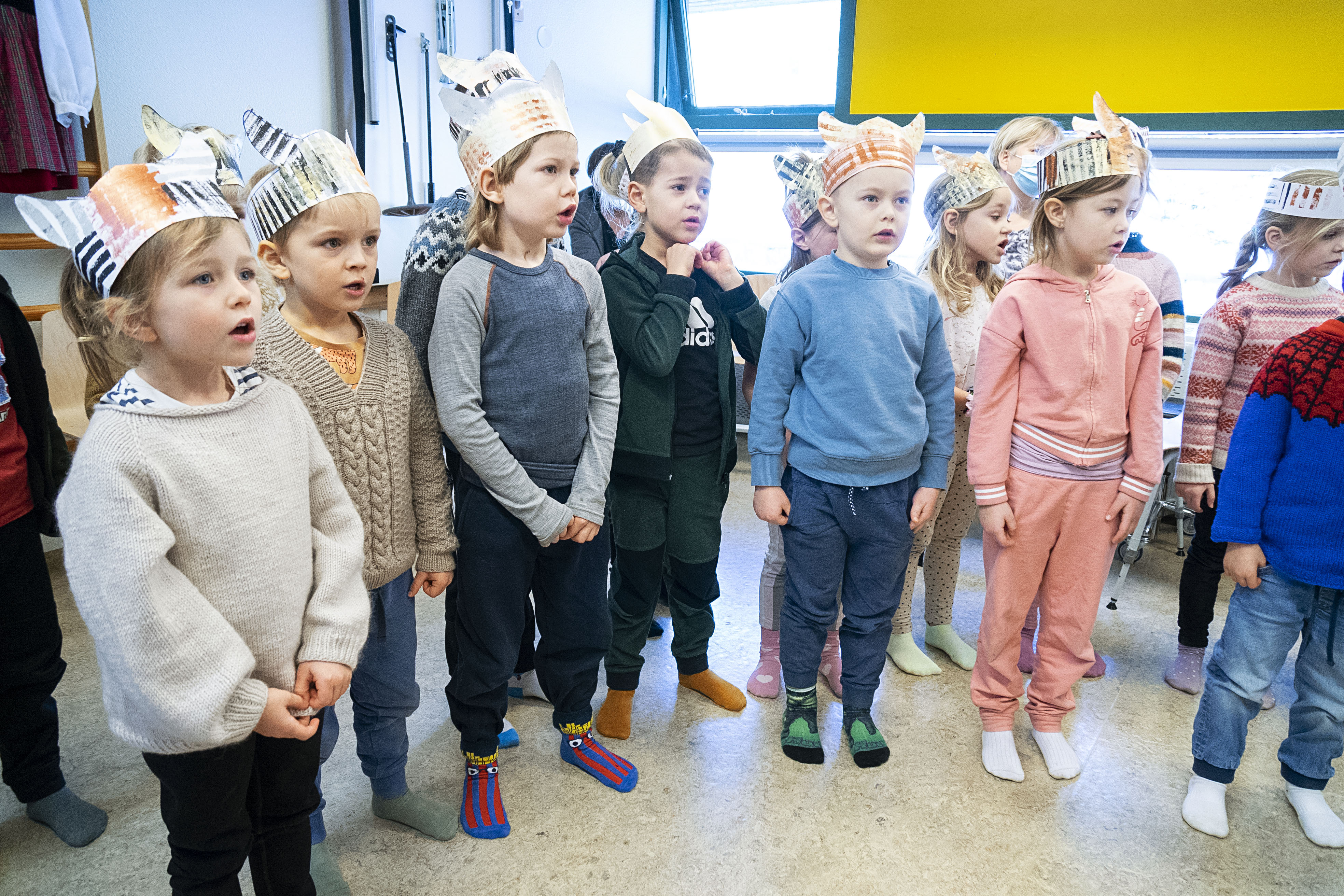 „Vitið þið hvað þetta er?“ spyr Guðrún Gunnarsdóttir, leikskólastjóri í Kvistaborg. Hún heldur á lofti sauðskinnsskó fyrir börnin sem hafa safnast saman á sal, skreytt þorrakórónum og í hátíðarskapi.