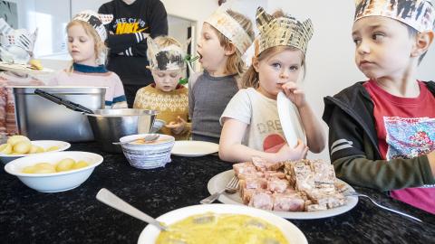 Í nýju húsnæði leikskólans hefur þorramatnum verið stillt upp á dúkað borð og á stórum diski liggja sviðakjammar. „Vá, eins og höfuð af risaeðlu!“ lýsir eitt barnanna yfir og þótt þeim virðist líka maturinn vel leggja fæst í kjammana.