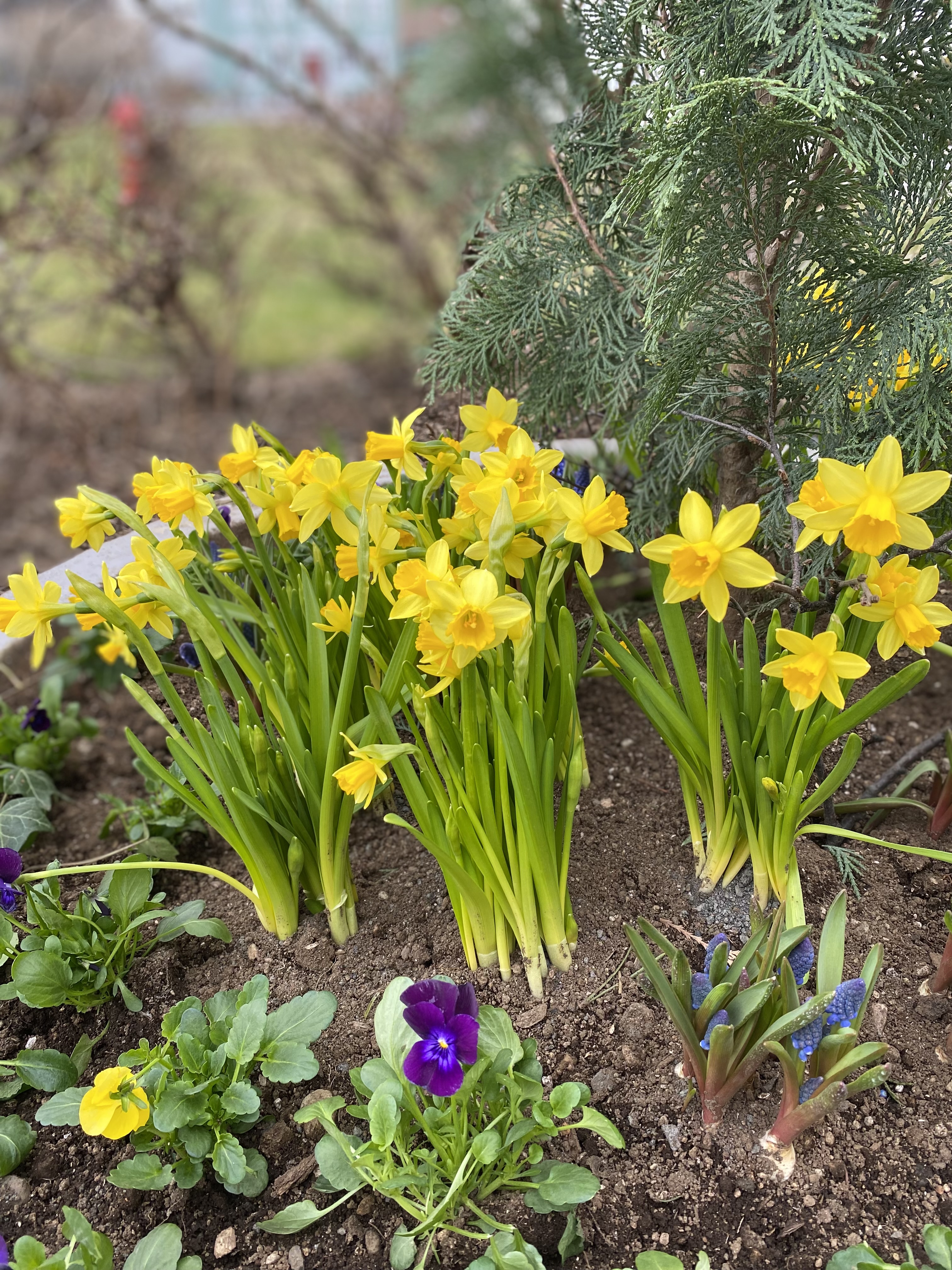 Í kerjunum eru páskaliljur, perluliljur, fjólur og sýprus. Þetta er í annað sinn sem fjólur eru með í páskaskreytingunum. Karen útskýrir að búið hafi verið að herða þær sérstaklega í Ræktunarstöð Reykjavíkur, svo þær myndu þola að vera úti á þessum árstíma.