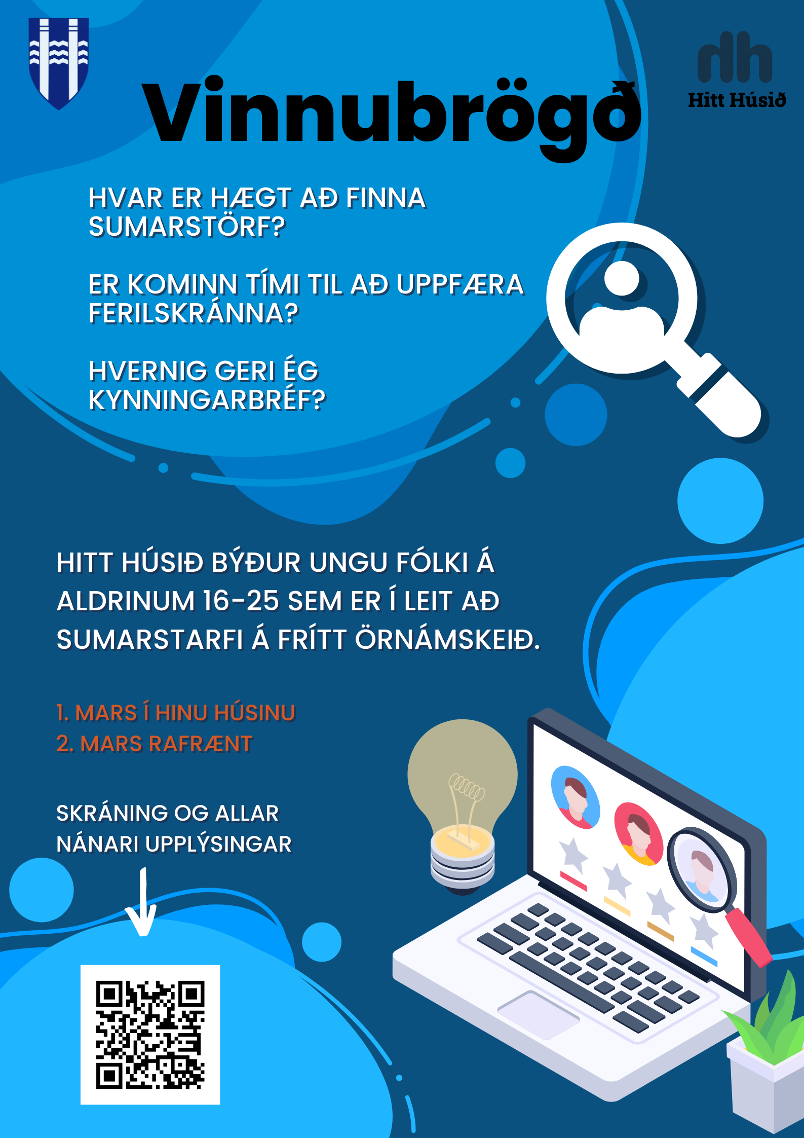 Hitt húsið býður ungu fólki sem er í leit að sumarstarfi upp á frítt örnámskeið, Vinnubrögð, þar sem ungt fólk fær aðstoð við allt sem tengist atvinnuleit. Farið er yfir uppsetningu ferilskrár, gerð kynningarbréfs og veittar eru upplýsingar um möguleg sumarstörf. Námskeiðið er tilvalið fyrir þau sem eru í leit að vinnu og langar í góð ráð.