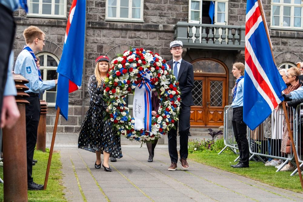 Að lokinni guðsþjónustu hófst formleg dagskrá á Austurvelli, í blíðskaparveðri, og var fjöldi fólks saman kominn til að fylgjast með athöfninni. Athöfnin hófst á því að forseti Íslands, hr. Guðni Th. Jóhannesson, lagði blómsveig frá íslensku þjóðinni að minnisvarða Jóns Sigurðssonar á Austurvelli. Kransaberar voru Tera Rún Jórunn Júlíusdóttir, nýsveinn í framreiðslu frá Menntaskólanum í Kópavogi og Tómas Böðvarsson, nýstúdent frá Menntaskólanum í Hamrahlíð.
