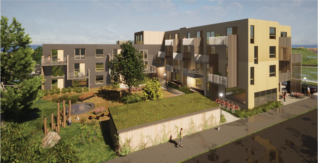 Á lóðinni verða 25 íbúðir, verslunar- og þjónusturými á jarðhæð en einnig verður torg við aðkomu að hverfiskjarnanum. Með þessu fyrirkomulagi með verslun og þjónustu á jarðhæð og íbúðir á efri hæðum er hægt að skapa lífvænlegan og skemmtilegan hverfiskjarna.