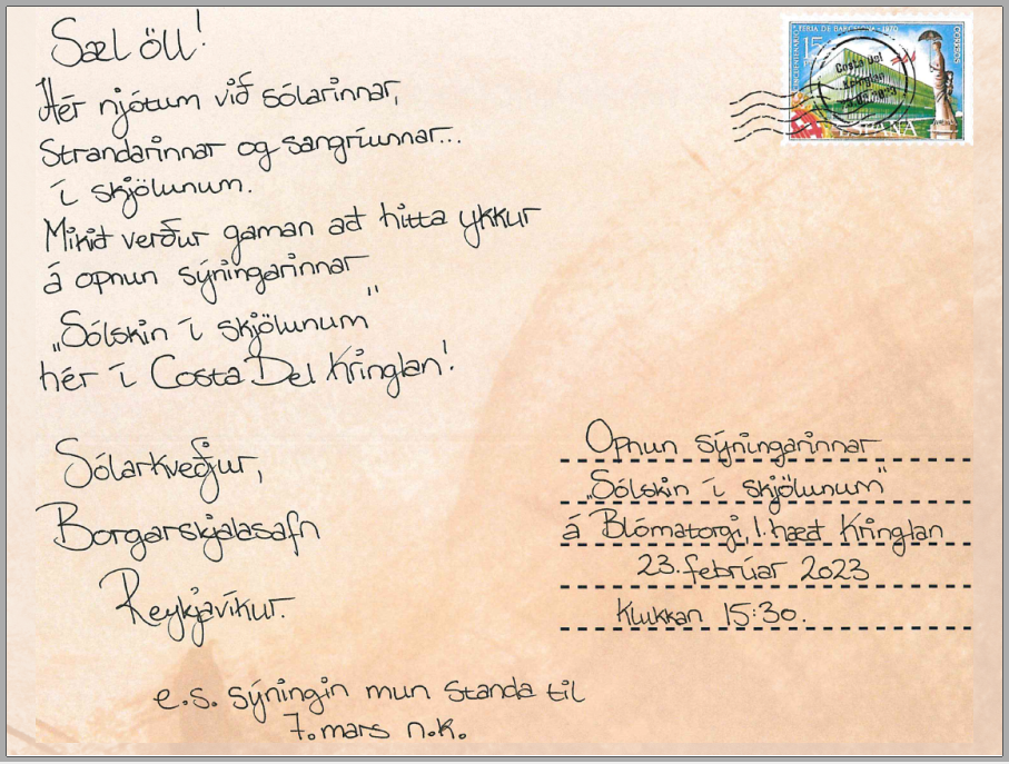 Sýningin Sólskin í skjölunum varpar ljósi á tímabil þar sem utanlandsferðir urðu að möguleika fyrir meginþorra íbúa landsins. Við upphaf áttunda áratugarins hófu íslenskar ferðaskrifstofur að skipuleggja beinar ferðir til sólarlanda. Sýningin er á vegum Borgarskjalasafns Reykjavíkur opnar á Blómatorgi Kringlunnar í dag fimmtudaginn 23. febrúar 2023 kl. 15:30.