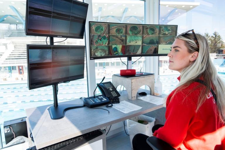 „Til að mega gerast sundlaugarvörður þarf að hafa náð 18 ára aldri og svo þarf að ljúka skyndihjálparnámskeiði og laugarvarðarprófi sem felur meðal annars í sér þolpróf, köfun, að geta kafað eftir og synt með annan einstakling og fleira,“ segir Dagbjört. „Hér í Laugardalslaug eru alltaf fjórir sundlaugarverðir á vakt; tveir úti á bakka, einn í turninum og einn hjá innilauginni. Við skiptum um staði á hálftíma fresti og höldum þannig góðum fókus.“