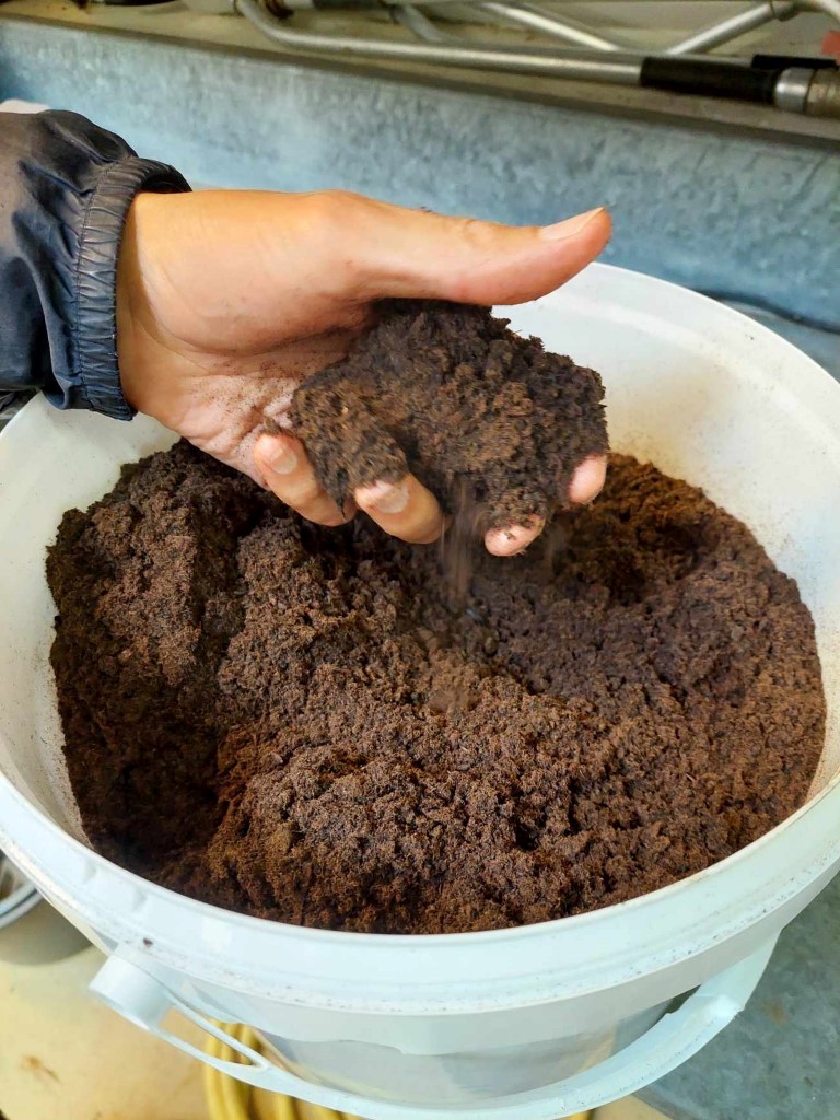 „Moltan er ótrúlega hrein og það kemur mjög á óvart,“ segir Hjörtur Þorbjörnsson forstöðumaður Grasagarðsins sem tekur við moltunni frá framleiðslueldhúsinu í tilraunaskyni. „Það er smá mólassalykt af þessu, eins og púðursykur. Allavega er lyktin alls ekki slæm, heldur bara mjög góð."