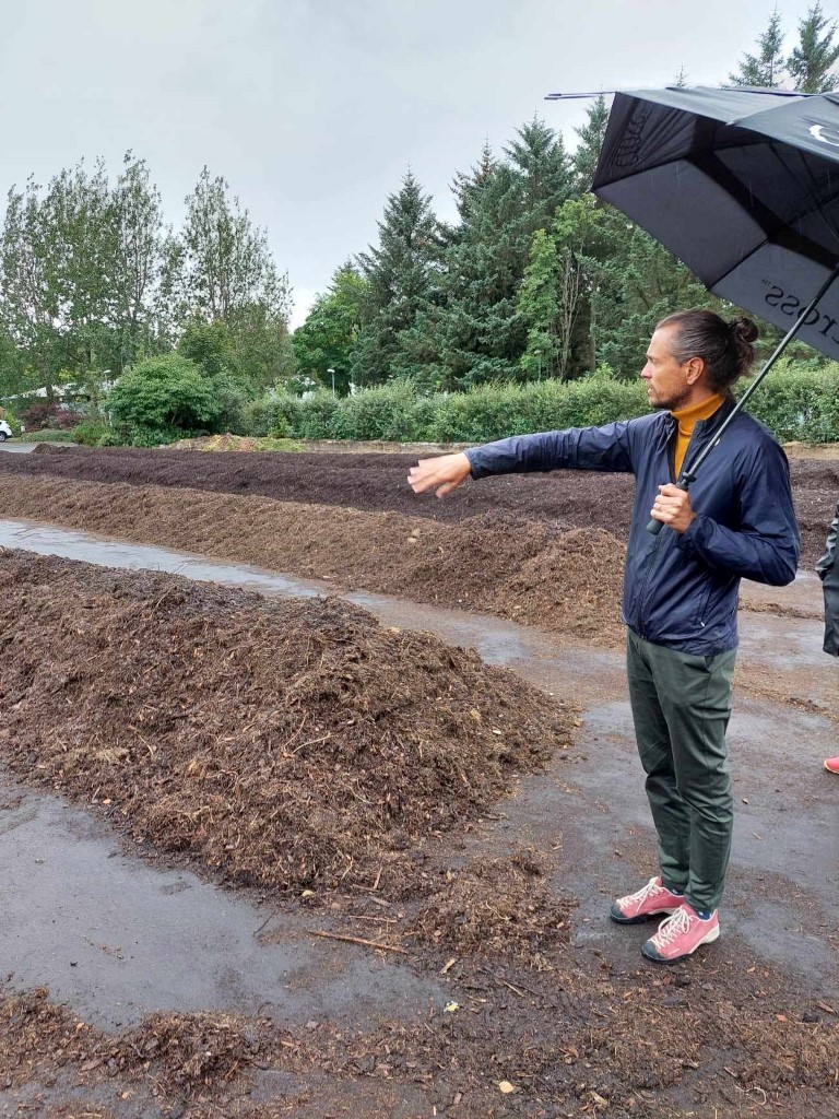 „Við ætlum að safna þessu í vetur og nota eitthvað af moltunni næsta sumar á grasflatirnar. Moltan úr matarleifunum inniheldur fjölbreyttari næringarefni en moltan úr okkar safnhaugum. Við erum með jarðvegshauga sem er snúið þegar hitastigið er rétt. Snúningurinn eykur súrefnið í haugnum og niðurbrotið verður hraðar,“ segir Hjörtur
