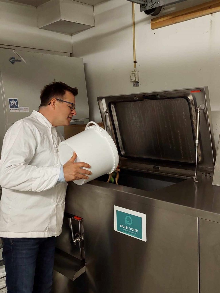 Mikið af lífrænum úrgangi, afskurði og afgöngum verða óhjákvæmilega til í stóru eldhúsi þar sem þúsund matarskammtar eru framreiddir daglega. Eyjólfur Einar Elíasson, framkvæmdastjóri framleiðslueldhússins hefur leigt sérstaka jarðgerðarvél í þeim tilgangi að minnka matarúrganginn og koma honum í góða nýtingu.