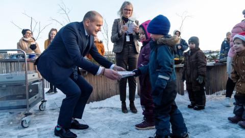 Guðni Th. Jóhannesson tekur við gjöf frá börnum í Dalsskóla, úti, í opinberri heimsókn.