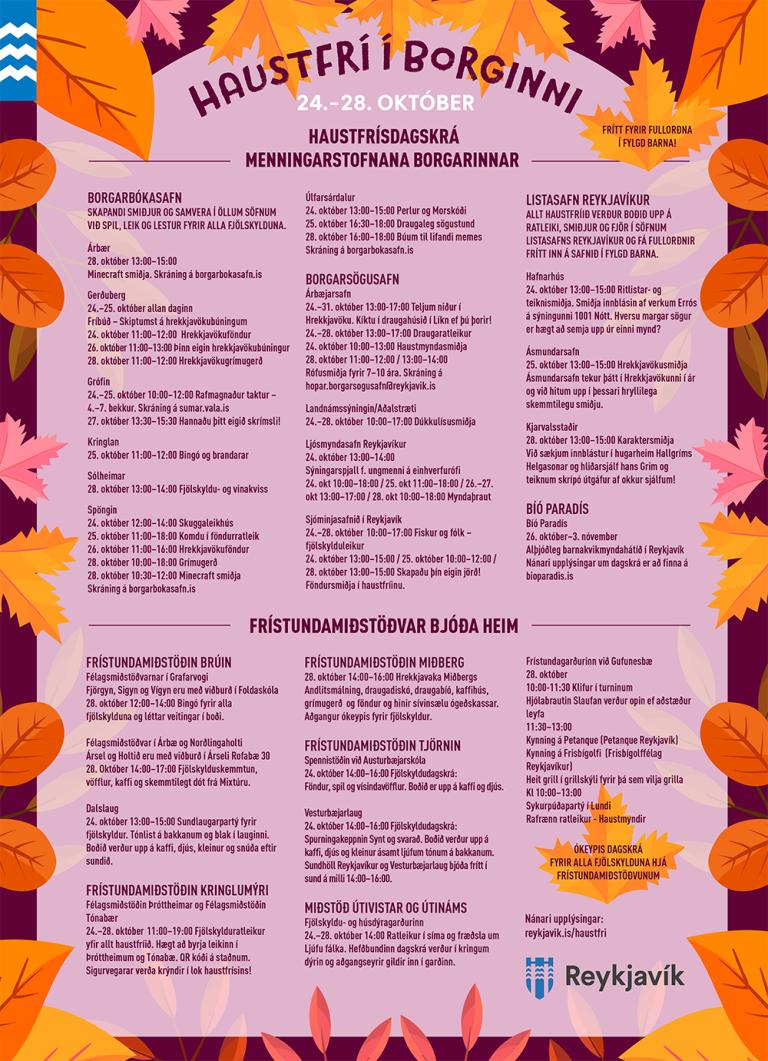 Haustfrí í grunnskólum Reykjavíkur stendur yfir frá 24. til 28. október og er úrvalið á viðburðum, sýningum og smiðjum fjölbreytt og spennandi. Í frístundamiðstöðvunum er boðið upp á allskyns afþreyingu eins og hrekkjavökugleði, bingó, sundlaugapartý, ógeðskassa, klifur hjólreiðar, ratleiki, föndur og útigrill.