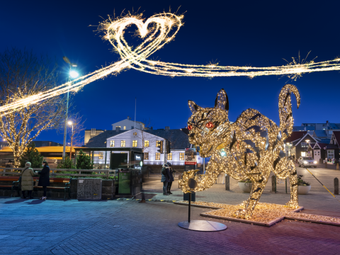 jólakötturinn á Lækjartorgi. Hjartalaga ljósmyndun fyrir ofan hann.