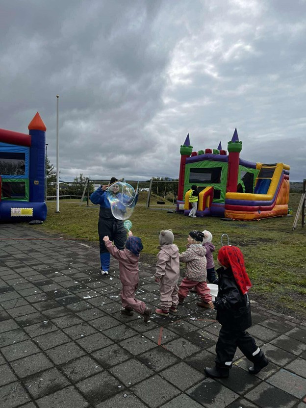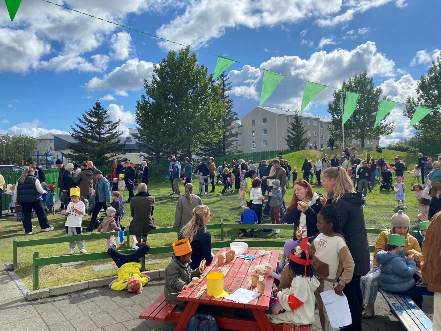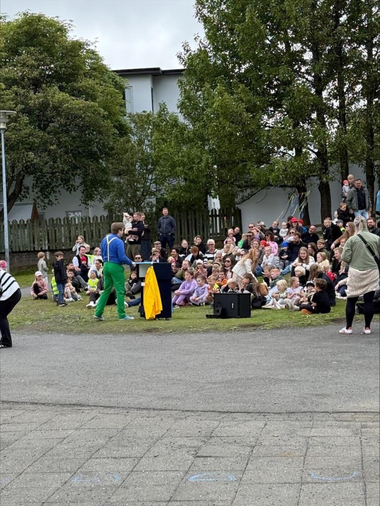 Í garðinum var hægt að leika sér með krítar, sápukúlur og ýmislegt sandkassadót. Foreldrafélagið sá um að grilla pylsur fyrir alla – börn, foreldra, systkini og ömmur og afa – og í eftirrétt fengu börnin frostpinna. Stemningin var létt og skemmtileg og pylsuröðin löng, enda allir í góðu skapi.