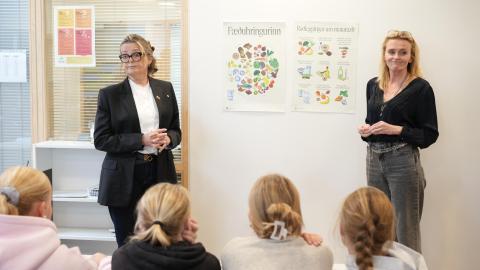 Nemendur í Dalskóla kynntu sér fæðuhringinn og nýjar ráðleggingar Embættis landlæknis um mataræði. Heiða Björg Hilmisdóttir borgarstjóri og María Heimisdóttir landlæknir hittu krakka í 8. bekk skólans í dag, ræddu mataræði og hengdu upp nýtt plakat með fæðuhringnum og ráðleggingunum á vegg í stofunni.