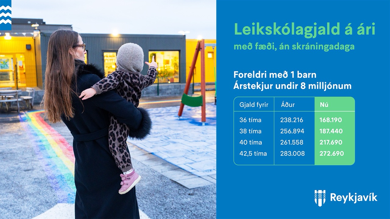 Leikskólaleiðin í Reykjavík felur í sér umtalsverðar breytingar á gjaldskrá fyrir leikskóla sem ætlað er að auka stöðugleika og bæta starfsumhverfi. Boðið verður upp á 36 tíma gjaldfrjálsa vistun, hóflegt gjald fyrir 38 tíma vistun og aukinn afslátt fyrir einstæða forelda og tekjulágar fjölskyldur. Þá verður lögð áhersla á að styrkja faglegt starf og efla íslenskukunnáttu starfsfólks.