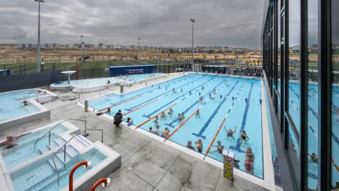 Fólk í heita pottinum á Ylströndinni í Nauthólsvík. Mynd tekin ofan frá. Búnaður til sjósundsiðkunar á bakkanum.