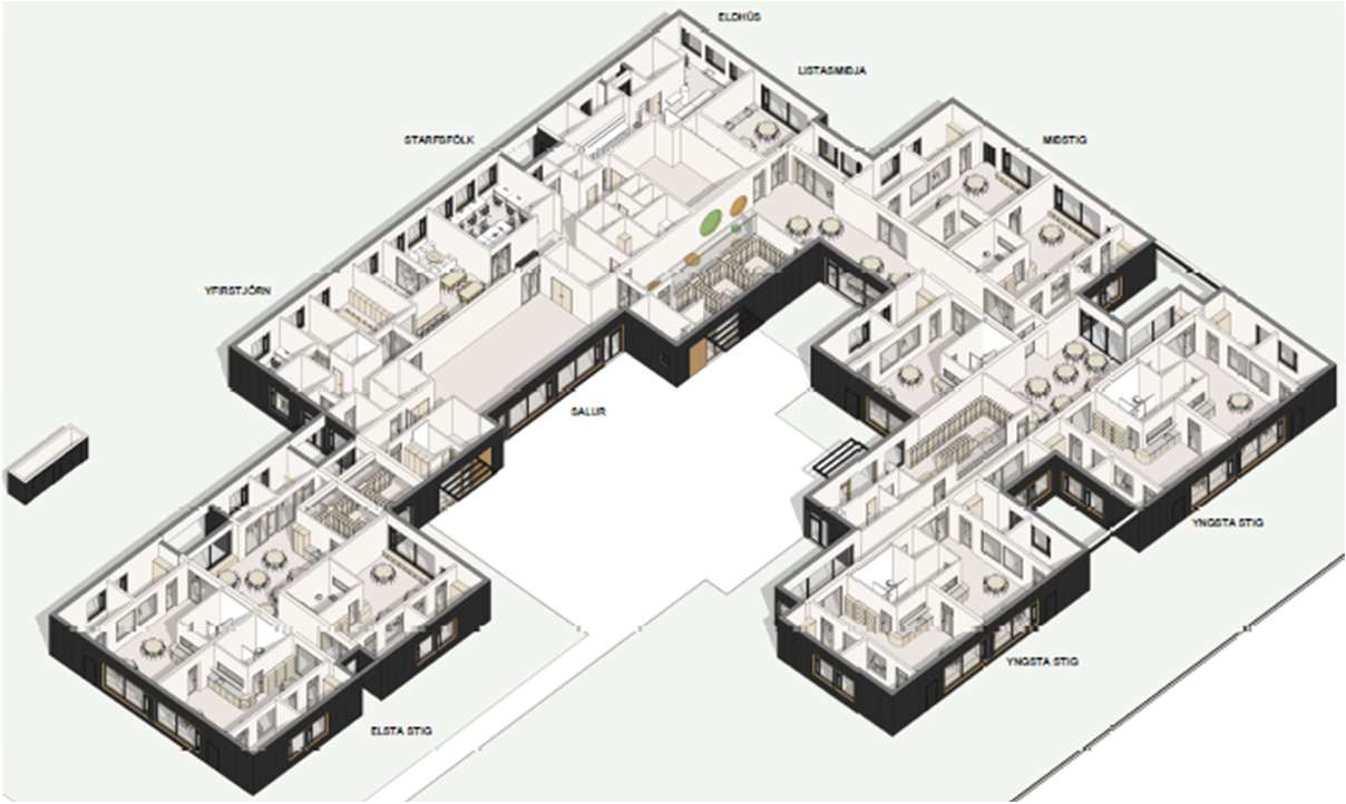 Yngstu börnin verða staðsett í suðurhluta byggingarinnar þar sem eru fjórar deildir. Miðstig skólans verður í austurhlutanum þar sem eru þrjár deildir og elstu börnin verða í norðvesturhluta byggingarinnar þar sem verða þrjár deildir. Í norðurhluta byggingarinnar, á milli deilda mið- og efsta stigs, eru fjölnotasalur, bókasafn og opið rými, listasmiðja, eldhús skólans ásamt aðstöðu starfsfólks.