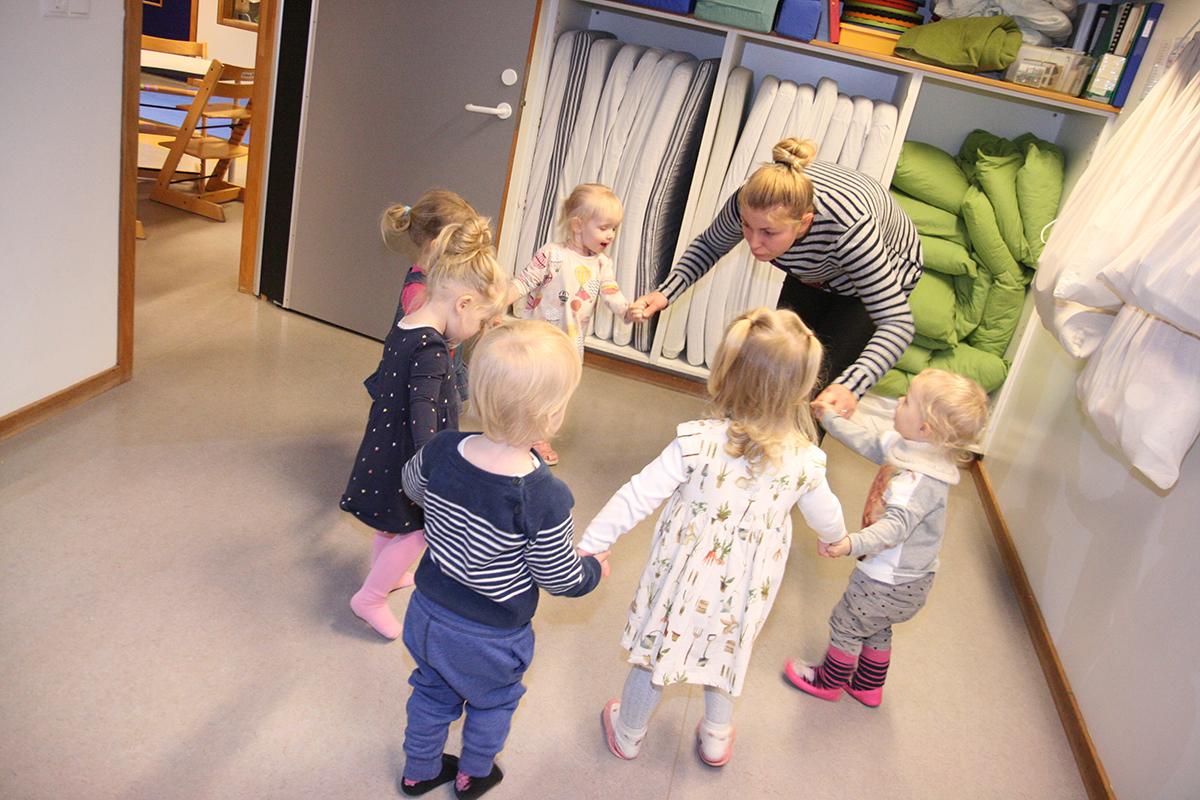 Leikskólabörn með kennara sínum.