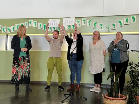 Börn og kennarar í Klébergsskóla gerðu sér lítið fyrir og tóku öll fjögur grænu skref Reykjavíkurborgar í einu. Umhverfisvitund er samtvinnuð skólastarfinu og beint að lokinni afhendingu verðlauna og samsöng drifu allir nemendur skólans sig út að plokka rusl.