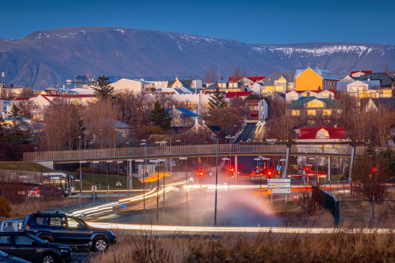 Yfirlitsmynd af Reykjavík og Esjunni.