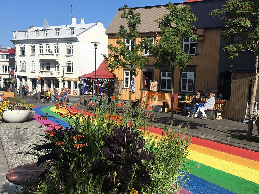 Fólk á regnbogamáluðum Skólavörðustíg á sólríkum degi.