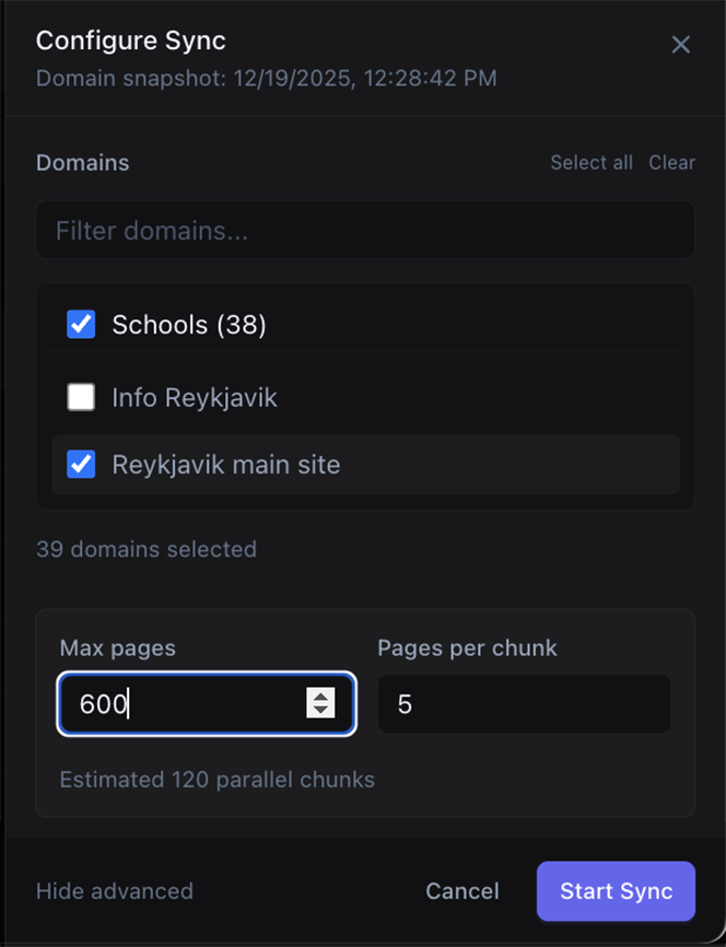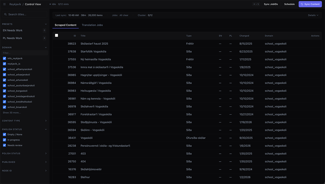 Nánast full þýðing á öllu vefefni yfir á ensku að undanskildum fundargerðum og einstaka efnisgerðum. Núna eru þúsundir síðna speglaðar og við þýðum nú einnig efni allra skóla borgarinnar, eyðublöð á Mínum síðum og fleira. Stöðugar umbætur á gæðum byggja á tilraunum með mismunandi líkön, líkanasamsetningar og aðferðir við skipanasmíð og -keðjur (e. prompting).