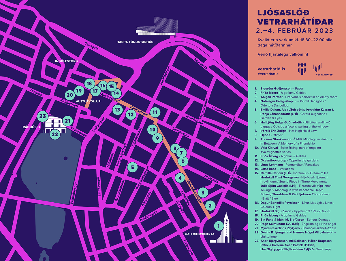 Ljósaslóð Vetrarhátíðar verður í lykilhlutverki en það er gönguleið ,frá Hallgrímskirkju niður Skólavörðustíg og á Austurvöll, sem er vörðuð með ljóslistaverkum.