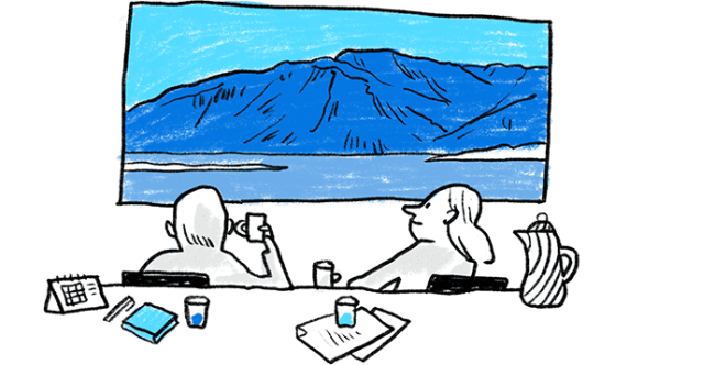 Teikning af tveimur mannsekjum horfa á Esjuna út um glugga.